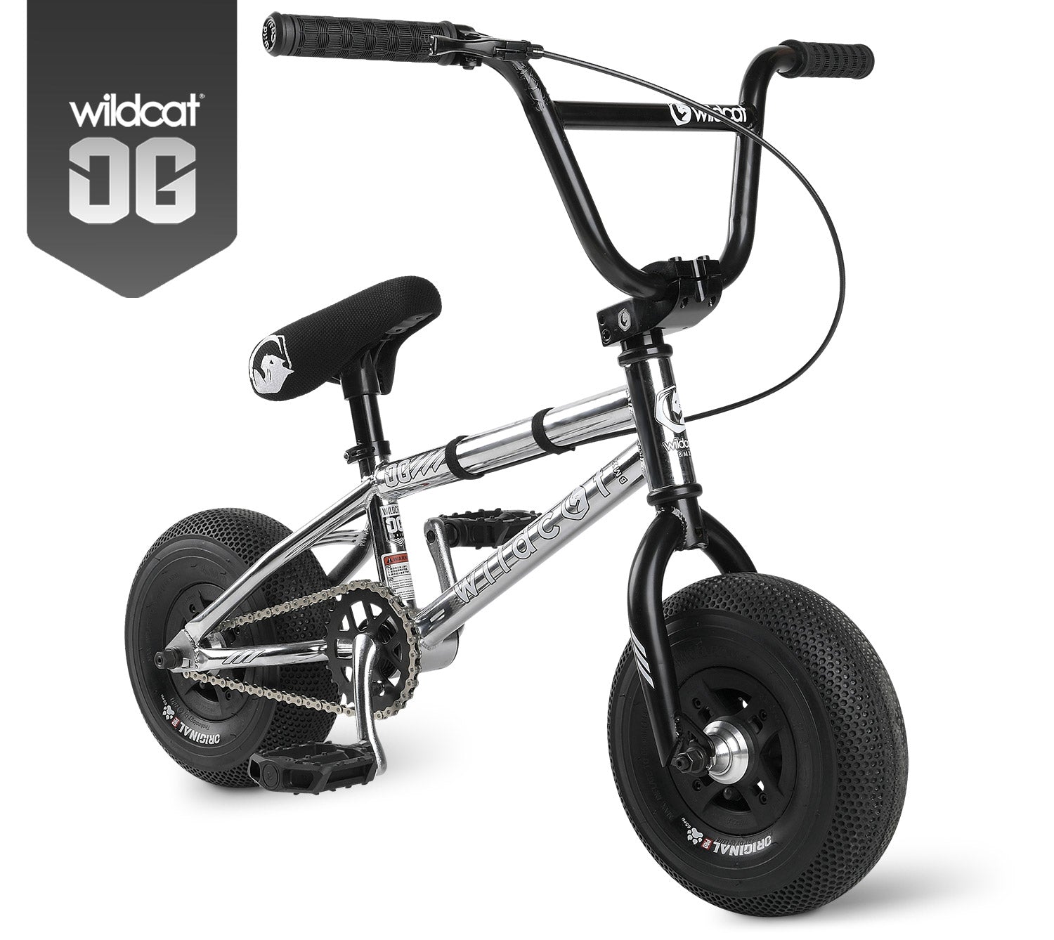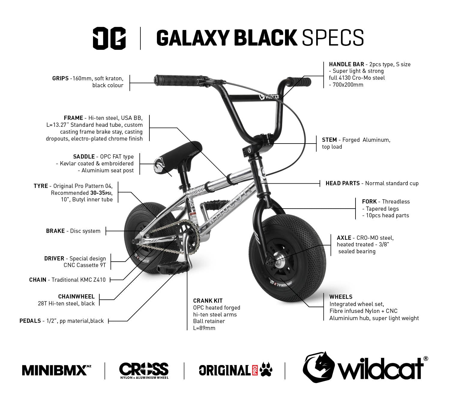 Built super tough for general skatepark and jump abuse, the OG features small size 2 piece Cro-Moly bars and a 1 piece heat-forged crank. All Wildcat Mini BMXs feature the specially designed 9 tooth Wildcat cassette hub for the perfect gearing ratio as well as fast, precise, and loud engagement. Tested successfully up to 100kg, but due to the high-impact style of riding we recommend over 80kg riders select the OG-PRO with the 3 piece crank + Turbo wheels.
